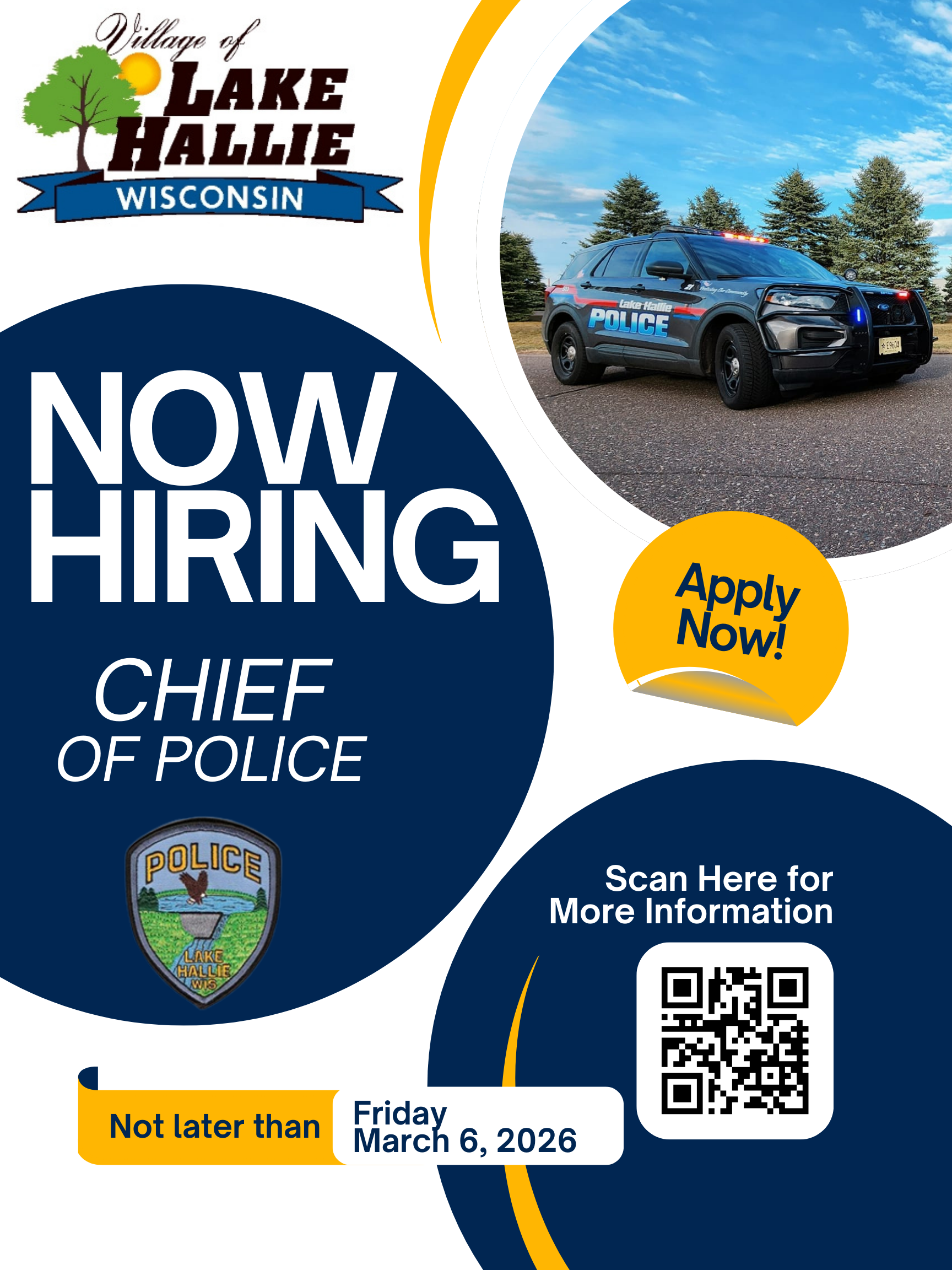 The Village of Lake Hallie, Wisconsin, is seeking a forward-thinking and community-centered law enforcement leader to serve as their next Chief of Police. Located in the heart of the Chippewa Valley between Chippewa Falls and Eau Claire, Lake Hallie is a growing and vibrant community of more than 7,400 residents and approximately 360 businesses.