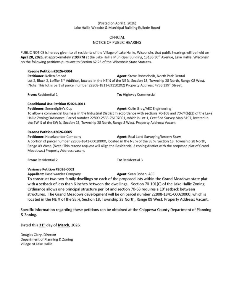 PUBLIC NOTICE is hereby given to all residents of the Village of Lake Hallie, Wisconsin, that public hearings will be held on April 20, 2026, at approximately 7:00 PM at the Lake Hallie Municipal Building, 13136 30th Avenue, Lake Hallie, Wisconsin on the following petitions pursuant to Section 62.23 of the Wisconsin State Statutes.