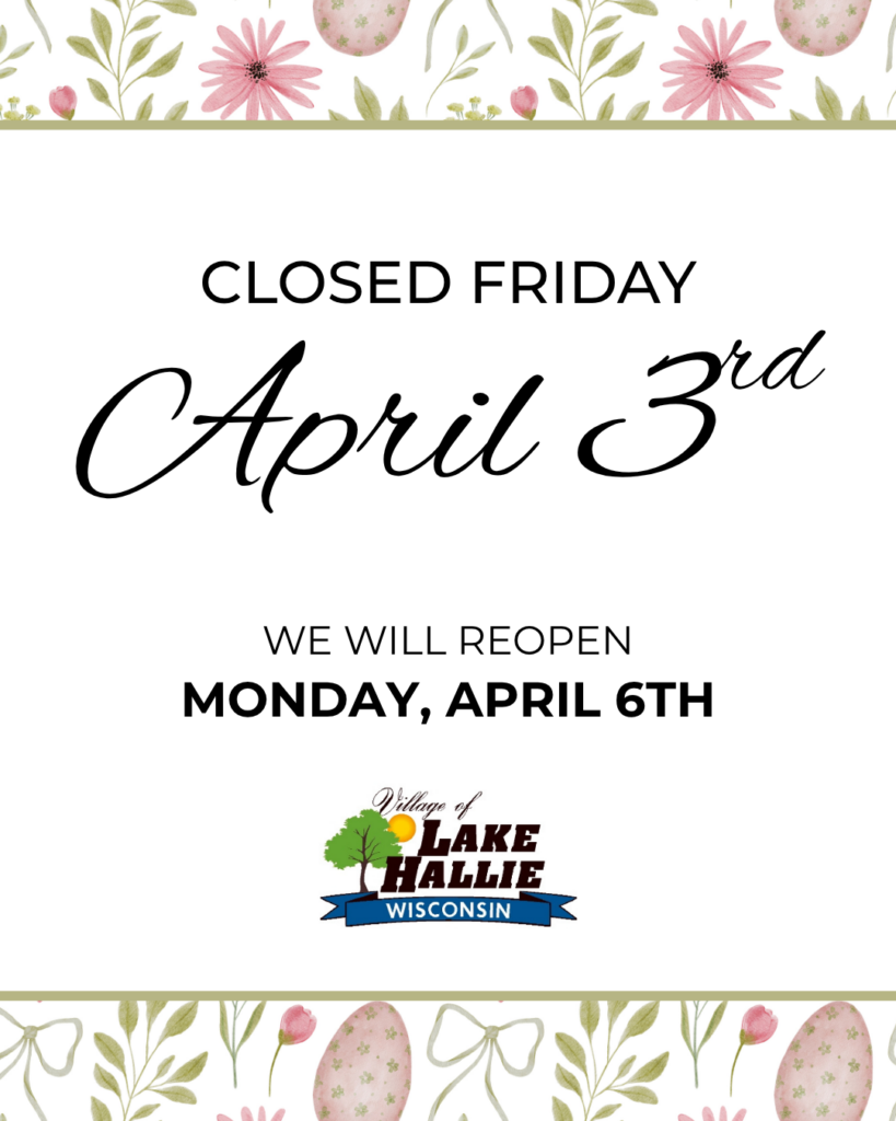 The Village of Lake Hallie offices will be closed on Friday, April 3rd in observance of the Easter holiday. Regular office hours will resume on Monday, April 6th at 8:00 a.m.